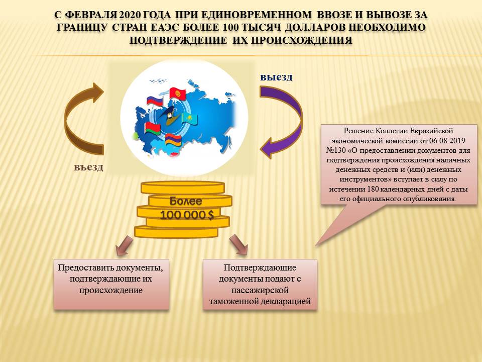 Бурятская таможня информирует, что с начала февраля 2020 года, пересекая границу, физические лица при таможенном декларировании наличных денежных средств и денежных инструментов в эквиваленте более 100 тысяч долларов США должны подтвердить их происхождение.
