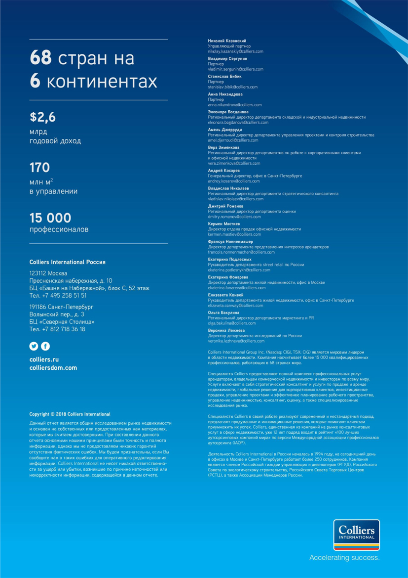 За 2017 год рынок качественной складской недвижимости в России в целом пополнился на 1,029 млн кв. м, продемонстрировав сокращение на 25% по сравнению с аналогичными показателем 2016 г. В 2017 г. компании продемонстрировали высокий спрос на качественные складские площади. В регионах России спрос увеличился на 47% и достиг 357 тыс. кв. м, в то время как в Москве и Санкт-Петербурге аналогичный показатель остался без значимых изменений по сравнению с 2016 г. Повышение спроса на складские помещения и низкий показатель ввода складских площадей в 2017 г. привел к сокращению вакантности в большинстве городов России. Суммарный объем свободных площадей в качественных складах регионах России составил около 300 тыс. кв. м или 4%.