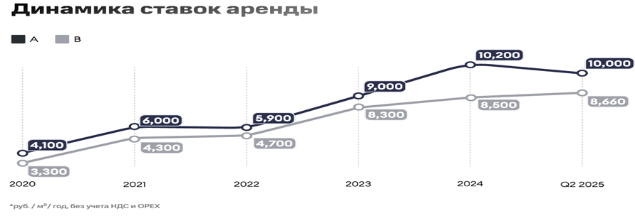 При сохранении низкой активности арендаторов возможна дальнейшая корректировка ставок аренды. С начала 2025 года вакансия в объектах класса А выросла с 1,1% до 3,7%, а стоимость аренды площадей снизилась на 2%, до 10 тыс. рублей за кв. м. В классе B вакансия увеличилась с 1,8% до 3%, а ставки выросли на 1,8%. Подобная динамика связана ограниченным предложением таких объектов и переключением спроса арендаторов в более низкий ценовой сегмент.