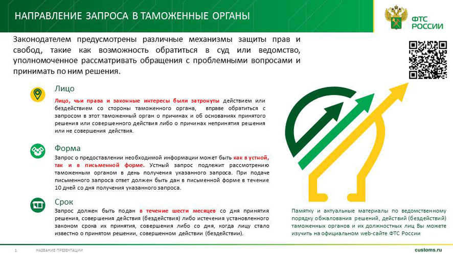 Способ подразумевает, что лицо, чьи права и законные интересы были затронуты действием или бездействием со стороны таможенного органа, вправе обратиться с запросом в этот таможенный орган о причинах и об основаниях принятого решения или совершенного действия либо о причинах непринятия решения или не совершения действия.