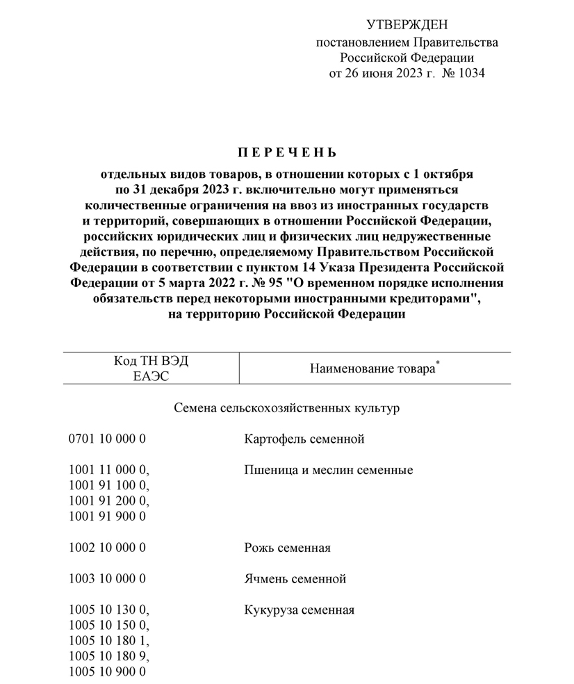 Постановление № 1034 от 26-06-23, Об отдельных видах товаров, в отношении которых могут применяться количественные ограничения на ввоз на территорию Российской Федерации